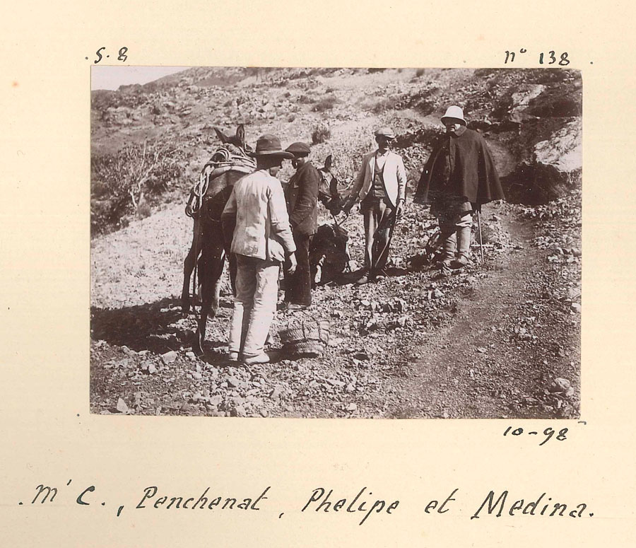 La ambición documental se traduce en una variedad de encuadres y temas que desbordan cualquier interés puramente geológico. Hay vistas generales que capturan la topografía con precisión cartográfica, pero también retratos espontáneos, escenas de trabajo, arquitectura popular y detalles domésticos que solo alguien instalado en el lugar habría podido registrar. Incluso los títulos manuscritos revelan una complicidad creciente con el entorno: «Porteurs de jambons», lejos de referirse a cargadores humanos, designa con humor galo a una piara de cerdos que atraviesa la Higuerilla, un guiño que delata la mirada irónica y afectuosa del autor.