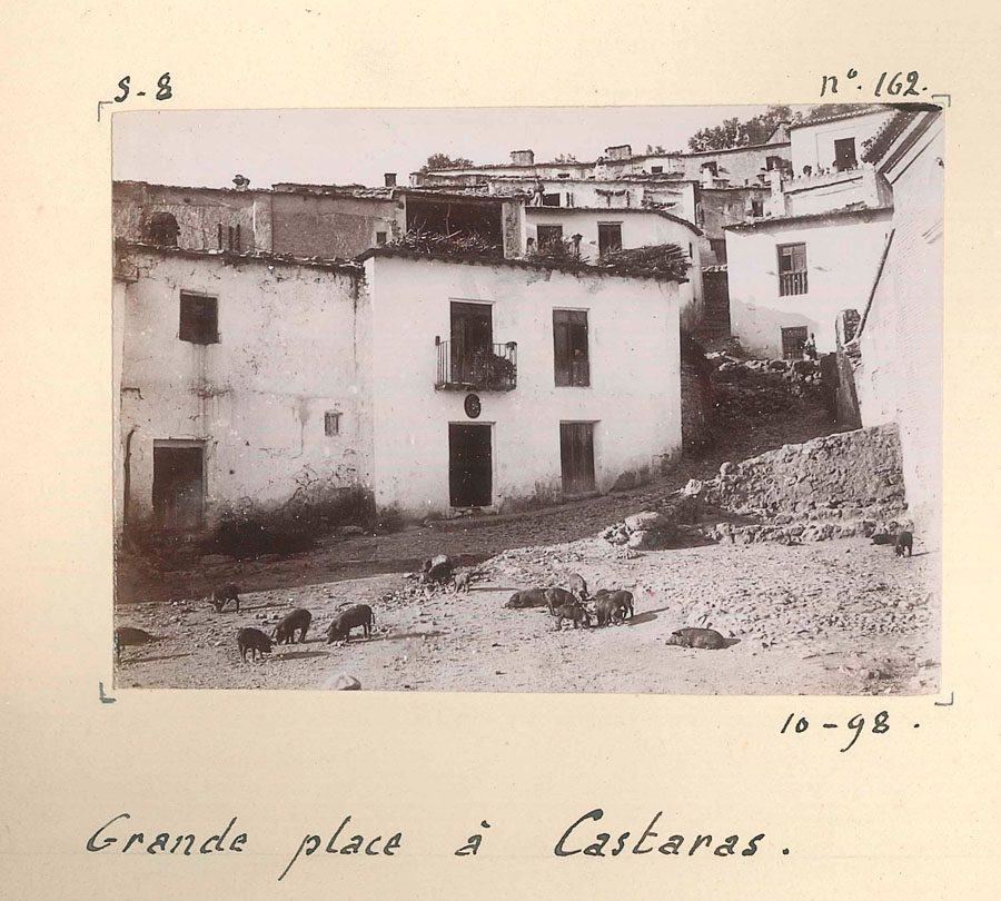Antes de adentrarnos en la atmósfera del álbum, conviene recordar que el relato que «Sironis» publicó bajo el título Dans l’Alpujarra —que citamos al inicio— no es un simple acompañamiento literario. Su descripción minuciosa de una estampa castareña, desde el despertar entre golondrinas hasta la vida detenida de la plaza y los perfiles de los tajos, coincide punto por punto con escenas fijadas en las placas del álbum. Esa correspondencia entre palabra e imagen convierte el texto en una guía sensorial que ilumina las fotografías y permite reconstruir, con una precisión inesperada, el mundo que Busquet observó y que la cámara preservó.
