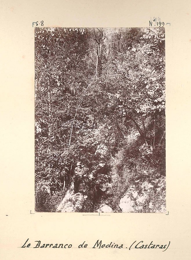 El Barranco de Medina, en cambio, introduce un registro distinto. La vegetación densa, la verticalidad del encuadre y la dificultad técnica de la toma generan una atmósfera casi opresiva. Aquí el agua y el monte se imponen sobre la arquitectura, y la presencia humana —probablemente la del ingeniero Piery— aparece reducida a una figura mínima. Es el paisaje como espacio de exploración, no de residencia.