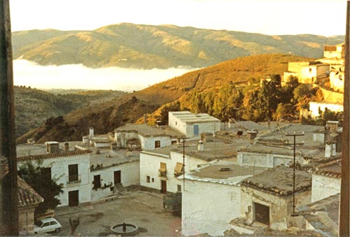 La mirada, sobrevolando los terraos, se fija en las copas de los álamos, sauces y fresnos que dora el sol: la bajura de estos verdores manchada de blanco por pequeños molinos cúbicos, desaparece parcialmente en la sombra de un profundo barranco. La vista lo sigue hasta el borde del precipicio que domina y encubre allá, muy al fondo, debajo del pueblo, al cauce del Río de Cádiar.