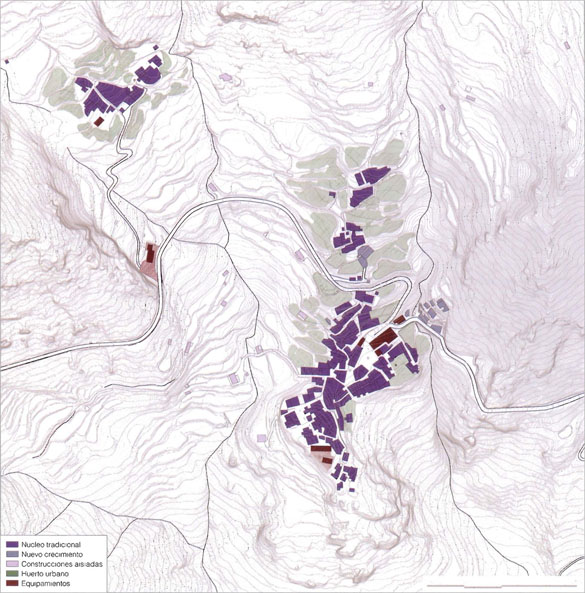 Esto ha generado que el núcleo haya adoptado una forma alargada que se extiende en dirección norte-su r, presentando un estrechamiento en la zona central, ya CJlue en este punto la pendiente del terreno se acentúa y dificulta el asentamiento. Los barrancos se configuran como los elementos naturales que marcan el límite de crecimiento por los bordes este y oeste, obligando al núcleo a un des~rrollo en el sentido perpendicular.