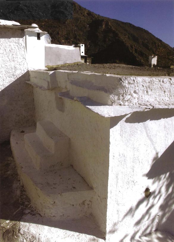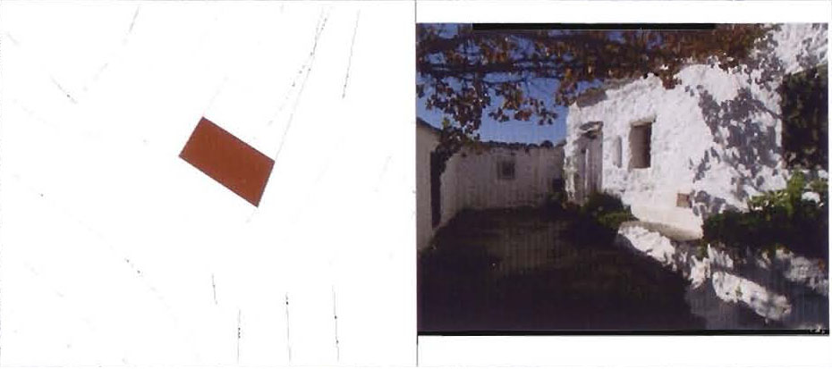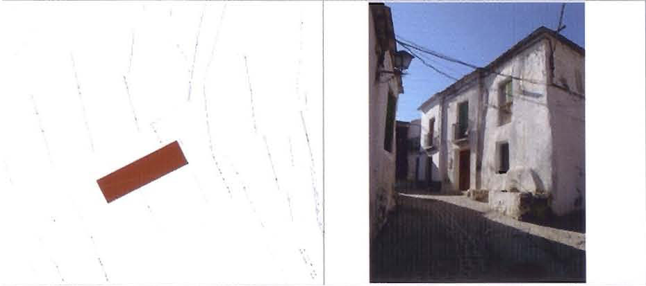 Descripción: Edificación de planta sensiblemente recangular, una altura y cubierta plana de launa con alero de lajas. La vivienda dispone 1 de un patio de entrada enfrentado a un paisaje de acusada topograi fía La fachada de la vivienda presenta tres vanos adintelados y un i banco corrido prolongado hasta el árbol adyacente. |