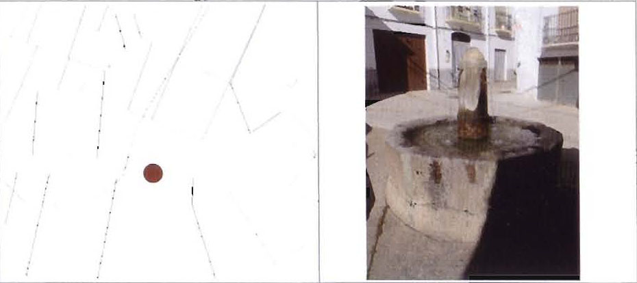 Datos históricos: No datado. Descripción: Fueme circular ubicada en el centro de la plaza Alfonso XII. Construido con sillares en forma de arco, los cuales presentan un rebaje en su encuentro con el suelo. En su zona central se situa un pilon de piedra del que salen 4 caños, que a su vez se encuentra rematado por un rebaje de forma semi-ovoidal. |