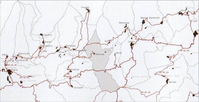 La segunda parte se ha dedicado al análisis más concreto de los veintiséis municipios elegidos, varios apartados que tratan de aspectos generales, evolución histórica, estructura del asentamiento y morfología urbana, finalizando el espacio dedicado a cada municipio con un catálogo de elementos singulares centrado en el núcleo principal del mismo —en nuestro caso Cástaras—– con fotografía, plano de situación y somera descripción de cada uno de ellos.