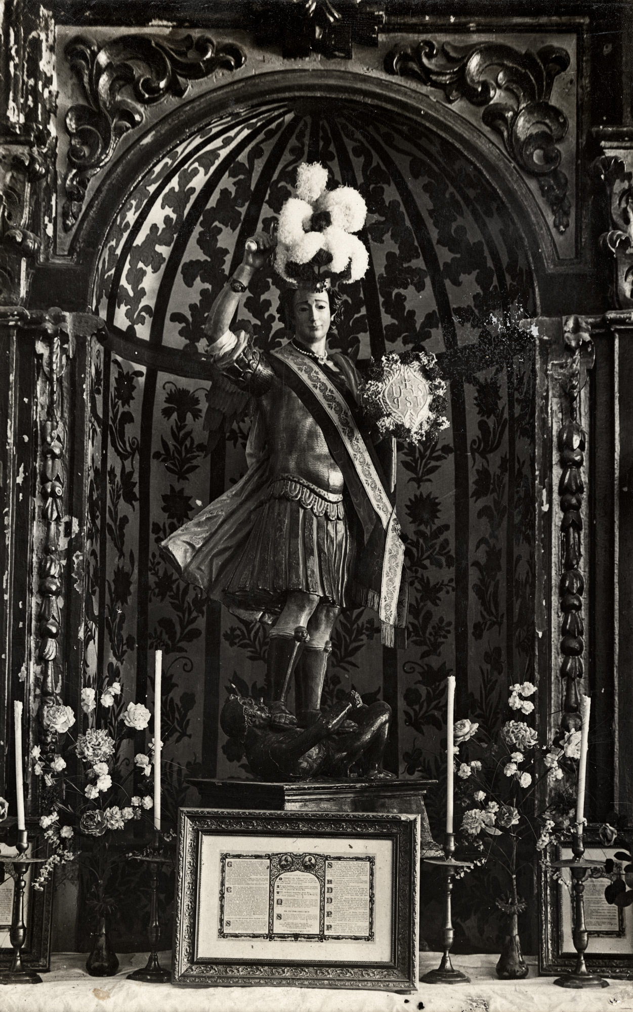 La imagen de san Miguel quemada en 1936, hacia 1915. (Fondo fotográfico de la Editorial Alberto Martín. Biblioteca de Cataluña).
